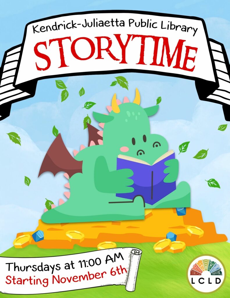 Storytime is returning to the Kendrick-Juliaetta Public Library on Thursdays at 11 am starting November 6. Our new building has the perfect area for telling stories, PLUS a park right across the street! Each week will have a story selected by our branch manager, Erin. We hope to see you there!